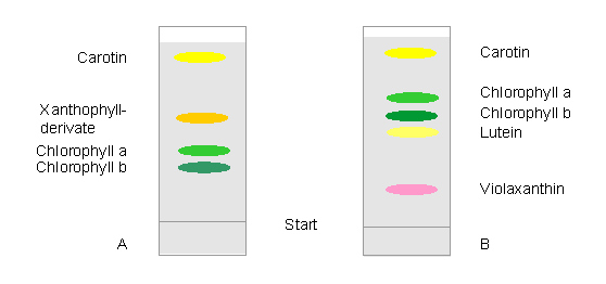 A.. Trennung auf Papier, Lösungsmittelgemisch:Petrolbenzin : Toluol : Chloroform : Isopropanol (89 : 5 : 5 : 1)B. : Dünnschichtchromatogramm