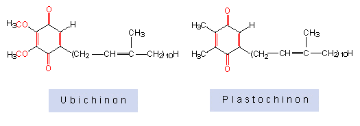 Sie wirken an Redoxreaktionen in Mitochondrien (Atmungskette) und Chloroplasten (Photosynthese) mit. Man unterscheidet zwischen den Ubichinonen und den Plastochinonen, die sich durch unterschiedliche Seitenkettenreste am Chinonring auszeichnen. Ein Ubichinon nimmt als "Koenzym Q" eine Schlüsselstellung als primärer Elektronenakzeptor im Photosystem II der Photosynthese ein.