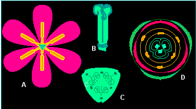Tulipa gesneriana (tulip). A. top view of flower, B. and C. pistil overall view, B. cross section through the ovary; D. generalized flower diagram. Flower diagrams were drawn in the last century by the German botanist A. EICHLER (1875, 1878) for most of the indigenous and foreign plant groups. They symbolize the position, number and the symmetry ratios of the flower's single components in every circle of petals (according to W. TROLL, 1975).