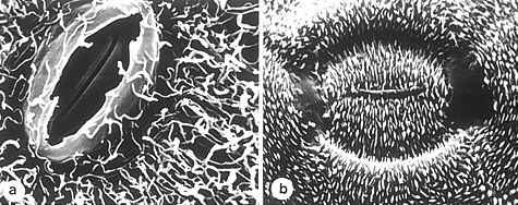 a. Stomate of a rose. Thread-like, reclining wax crystalloid, characteristic for many Rosaceae. b. Stomate of a lily of the valley (Convallaria majalis). The wax plates are arranged in a way that resembles the line of force pattern an electromagnetic coil generates. This wax pattern is restricted to the three monocot orders Liliales, Asparagales and Burmaniales. It is a feature of classification.