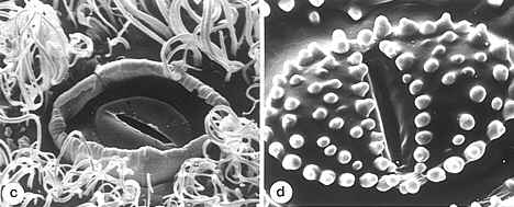 c. Stomate of the bird of paradise flower Strelitzia reginae (Musaceae). Massive, compound wax rods that form a dense waxy frill around the stomate. This 'Strelitzia-type' of epicuticular wax patterns is restricted to the monocot groups Areciflorae, Commeliniflorae and Zingiberiflorae as well as to the Bromeliales and the Velloziales and is used for their classification. d. Stomate of the common horse tail Equisetum arvense. Siliceous bodies below the cuticle stand out of the surface like knots.