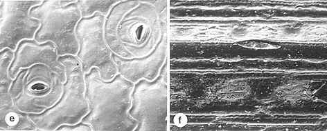 e. Echeveria (Crassulaceae): Stomate at the undersurface of a leaf. The subsequent divisions leading to the generation of the stomate become apparent. The ontogeny of this stomate belongs to the 'Sedum-type'. f. Typical monocot epidermis of the grass Schizachyrium with cells arranged in rows. [W. BARTHLOTT, D. FRÖHLICH, 1983; H-D. BEHNKE, W. BARTHLOTT, 1983; W. BATHLOTT, 1985 (a)]