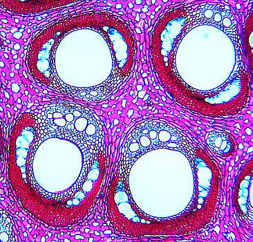 A liana with vascular bundles that contain one vessel with an exceptionally large lumen each. Staining: astra blue, acridine red / chrysoidine (slide preparations: G. SEEHANN, 1986)