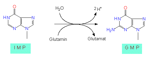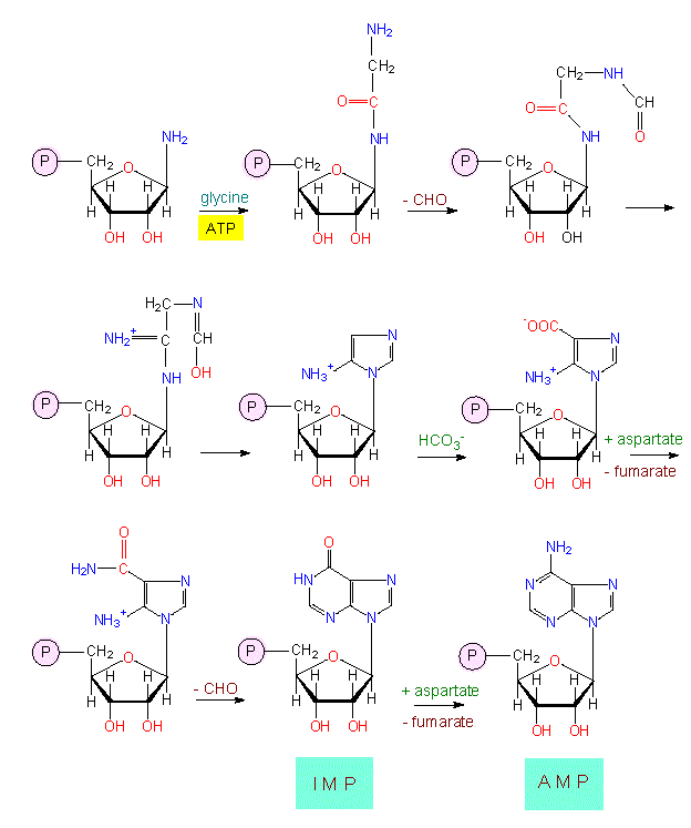 Depending on the structure of the base, it is distinguished between purines and pyrimidines. For the synthesis of a purine system, a molecule of aspartate, carbon dioxide, glycine and glutamine each and two formal-groups (transferred by tetrahydrofolic acid) are needed. For the initiation of synthesis, the already mentioned phosphoribosylphosphate is necessary. This means that already the first precursor of the base is coupled to a sugar and a phosphate residue. The first intermediate with a complete ring system is inosine monophosphate (IMP) the precursor of both AMP and GMP. The extensive list of starting compounds shows that the synthesis pathway is very energy-consuming. This is also the reason why purine residues are normally not degraded by the cell but are re-used and, if necessary, modified.