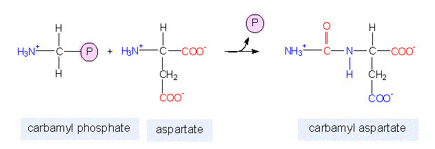 In the synthesis of pyrimidine, the ring-system is completed first. Starting compounds are aspartate and carbamyl phosphate. The latter is produced in the cytosol from the amino residue of the amino acid glutamine, free bicarbonate and the terminal phosphate residue of ATP: