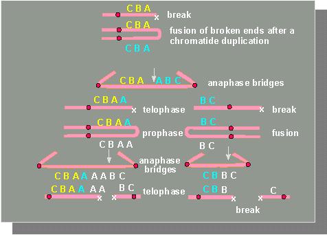 Bridges are formed during anaphase whenever two chromosomes fuse at their ends generating a fusion product with two centromers. If these two are subsequently torn to different poles then will inevitably occur a chromosomal fraction. During the following S-phase of the interphase nucleus is a chromatid with a fraction at its terminus replicated in just the same way as the other chromosomes leading again to a fusion of the homologous chromatids. Consequently can a chromosome consisting of just one chromatid but two centromers be found in the subsequent mitosis instead of a chromosome out of two chromatids and one centromer. The consequence is a second fraction during anaphase where the second round of the cycle starts.