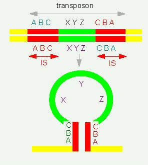 Structure of a Transposon: At the top: within a DNA double strand, at the bottom: when denaturing the double strand (just one of them is shown). The inversely oriented IS elements (insertion elements) at the ends of the transposon form double stranded segments.