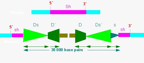 Similar conditions can be found in Drosophila. It showed that the active element here differs from the passive only in an intern deletion. Consequently were also the Ds- and Ac sequences examined. N. FEDEROFF (Carnegie Institution of Washington) found out when hybridizing isolated Ds with Ac DNA that the first differs actually from the latter in that it lacks an intern segment of roughly 200 base pairs. The analyzed Ac element consisted of 4300 base pairs, the respective Ds element of 4100. Another Ds allele had just 1700 base pairs.