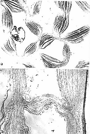 a. Electron microscopic picture of a cross-section through collenchyma cells of Curcubita leaves after removal of non-cellulose parts and fixation with permanganate. This treatment dissolves the middle lamella, so that the cells splay. The single lamellas run around the cells like rings. In 'thin' parts of the wall are they closer together, while the distances between them are larger in 'thick' parts. Encrustations of other substances like hemicellulose and others cause the thickening. The number of lamellas stays constant.b. Electron microscopic picture of a cross section through a neighbouring epidermis cell of Curcubita leaves. The lamellas consisting of cellulose change continuously to the periclinal walls. Lamellas on top of each other alternate by 90 degree. In certain areas is an orientation vertical to the plane of the image predominant (B. P. DESHPANDE, 1976).