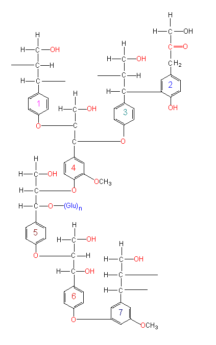 It consists mainly of coniferyl alcohol residues, for a minor part of coumaryl alcohol residues. Shown is a detail of the three-dimensional network of this polymer (according to K. FREUDENBERG and A. C. NEISH, 1968)