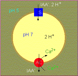 The hypothetical model of a plasma membrane vesicle. S = specific auxin-proton carrier (symport), AC = specific auxin-anion carrier (active antiport). The driving force of the IAA flow through the membrane is a proton gradient (according to R. HERTEL et al., 1983).