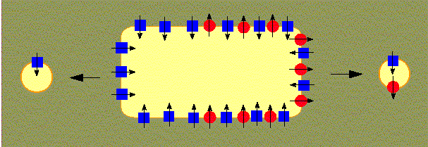 Vesicles of Curcubita hypocotyl or Zea mays containing auxin carriers can be dismantled into smaller vesicles (on the left and on the right of the illustration). After centrifugation in a dextran-sucrose gradient is a vesicle fraction obtained that has just one type of auxin carrier (S, blue). Its effect is not influenced by a specific inhibitor. On the other hand is a fraction gained that contains both types of auxin carriers (red and blue). The activity of one of them can be influenced by an inhibitor (R. HERTEL, 1988).