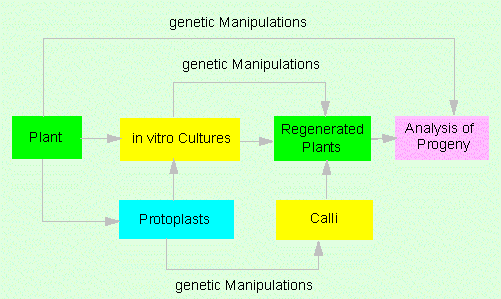 Callus cultures, embryo cultures, cultures of anthers, etc. can all be regarded as in vitro-cultures. In a classic sense, genetic manipulations are mutagenesis, induction of polyploidy, etc. Nowadays, genetic engineering has to be added. Offspring analysis means the selection of wanted genotypes (H. LÖRZ, 1986).