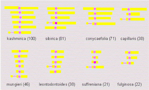 In the course of evolution, the number and the sizes of the chromosomes was reduced. The given numbers are the percentages, with Crepis kashmirica being 100 % (according to E. B. BABCOCK, 1947).
