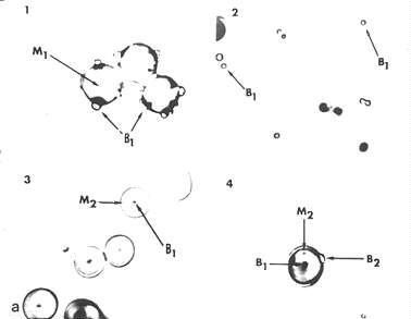 As soon as a microsphere (M1) has obtained a certain size (1), it forms buds (B1) that bud off (2). Each of these buds is the beginning of a new generation of microspheres (M2) (3) reproducing again by budding (4). Electron microscopic picture of a cross-section through a budding microsphere. Look at the double layer produced by self-assembly of proteinoids of the microsphere membrane. The dimensions of this double layer do not tally with those of a phospholipid double layer of a cellular membrane (S. W. FOX, 1973).