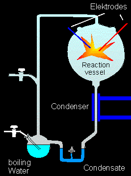 It shows a closed reaction system that can be filled with the mentioned gases at different ratios and concentrations. Energy can be supplied by heating, electrical discharges, high pressure or ultraviolet radiation. After a reaction period of several days or weeks, MILLER was able to detect a number of organic molecules, among them formaldehyde, cyanide, carbodiimide, organic acids, amino acids, and many others. The spectrum of molecules changed depending on the experimental conditions.