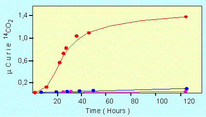 The catalytic activity of a proteinoid. The observed reaction was the decarboxylation of pyruvate, red: in the presence of a proteinoid, blue: in the presence of a mixture of free amino acids, and pink: without additive (according to S. W. FOX and K. DOSE, 1972)
