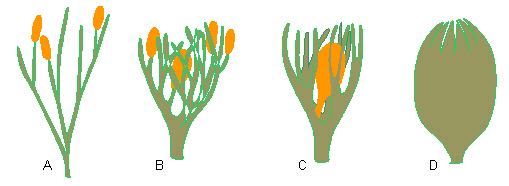 Sukzessiv aufeinanderfolgende Schritte, die zum Einschluß eines Sporangiums durch Nucellus und Integument führten, so wie es bei den Samen der Pteridospermen in Erscheinung tritt. A. terminal sitzende Sporangien (Rhynia), B. Übergipfelung eines Sporangiums durch fertile und sterile Telome (Hedeia corymbosa). C. ein hypothetisches Stadium. Ein vergrößertes Sporangium, das von einem Telomnetzwerk eingeschlossen wird. D. Samen mit Sporangium (Nucellus), von verwachsenen Telomen (= Integument) umgeben (Nach WALTON, 1940, aus H. N. ANDREWS, 1961).