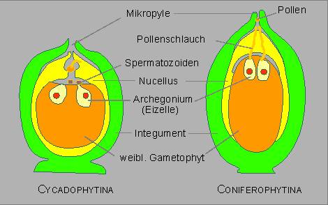 Die erste Voraussetzung für einen Befruchtungsvorgang ist das Eindringen von Pollen durch die Mikropyle in die Pollenkammer, die zweite, das Auswachsen eines Pollenschlauchs, in den (bei den Coniferophytina) der männliche Gametenkern einwandert und der mit der Eizelle Kontakt aufnimmt. Nach der Fusion der beiden Zellen kommen männlicher und weiblicher Kern zusammen und verschmelzen zu einer Zygote. Bei den Cycadophytinae dient der Pollenschlauch ausschließlich der Ernährung des männlichen Gametophyten.