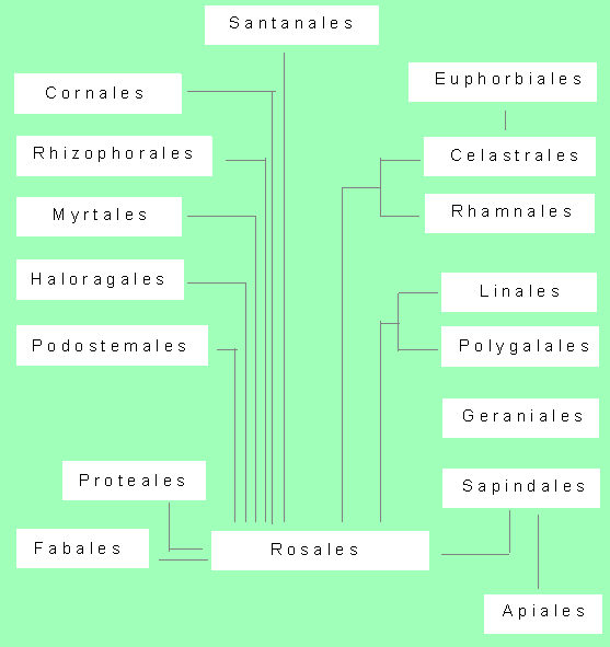 Rosidae: Ein phylogenetisches Schema zur Darstellung der Beziehungen zwischen den einzelnen Ordnungen (A. CRONQUIST, 1981).