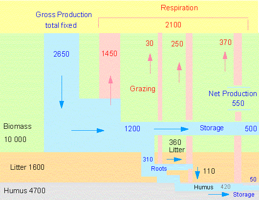 The data given in this illustration were collected in an oak forest close to the Brookhaven National Laboratory at the East Coast of the United States of America. 2,100 grams of the annual gross production of 2,650 grams of dry matter per square meter are lost in respiration. The remaining 550 grams are stored as new plant growth, litter, and humus. The oak forest belongs to the 'late successional' forests in which only 20 % of the total production are used as new material while 80% of the production is expended in respiration (according to G. M. WOODWELL, 1970).
