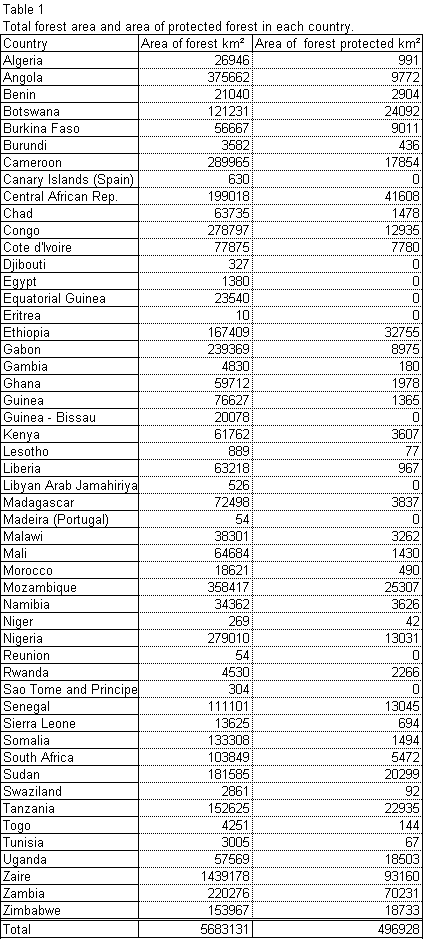 Table showing total forest area (kmē) and the area of the amount protected in each Country.