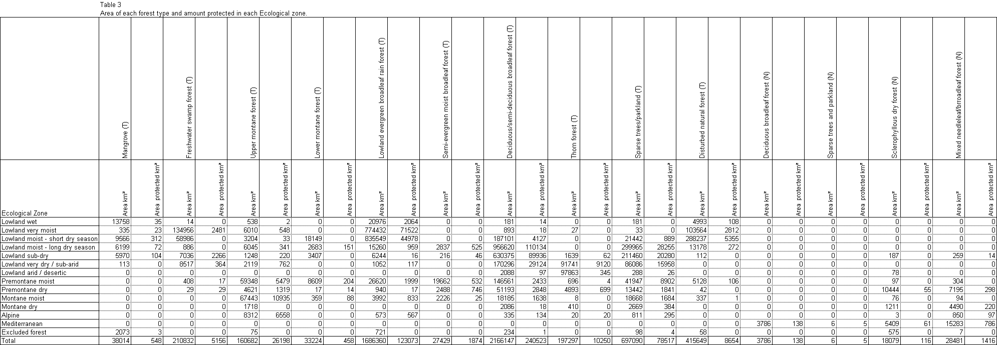 Table showing the total area of each forest type (kmē) in each ecological zone, and the area of the amount protected.