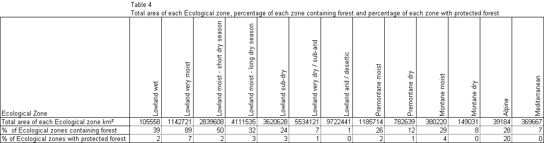Table showing the total area of each ecological zone, percentage of each zone containing forest and the percentage of each zone with protected forest.