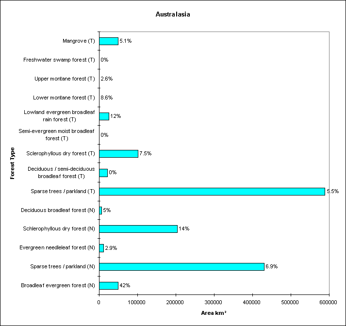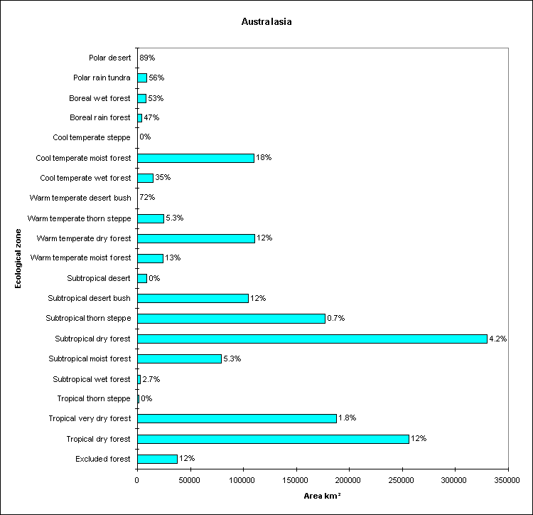 Bar chart showing the total area of each forest type, with the percentage protected written above each bar.