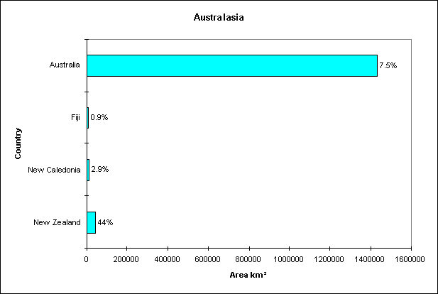 Bar chart showing the total area of forest in each Country, with the percentage protected written above each bar.