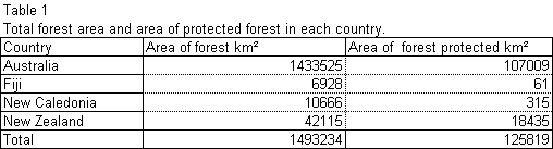 Table showing total forest area (kmē) and the area of the amount protected in each Country.