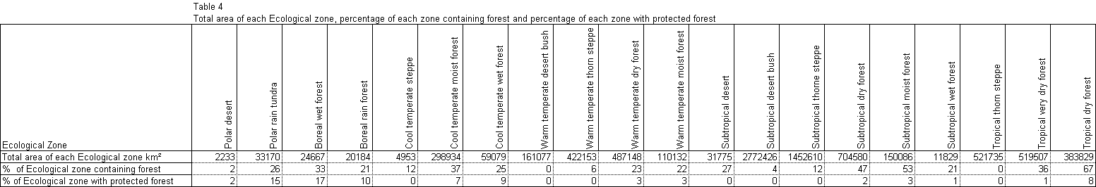 Table showing the total area of each ecological zone, percentage of each zone containing forest and the percentage of each zone with protected forest.