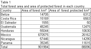 Table showing total forest area (kmē) and the area of the amount protected in each Country.