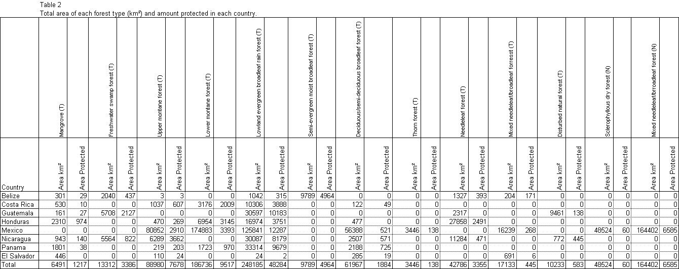 Table showing the total area of each forest type (kmē) and the area of the amount protected in each country.