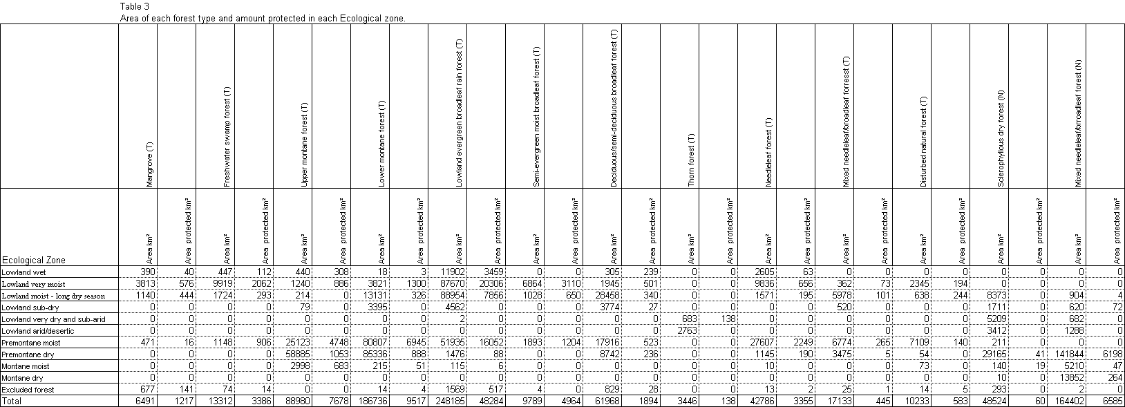 Table showing the total area of each forest type (kmē) in each ecological zone, and the area of the amount protected.