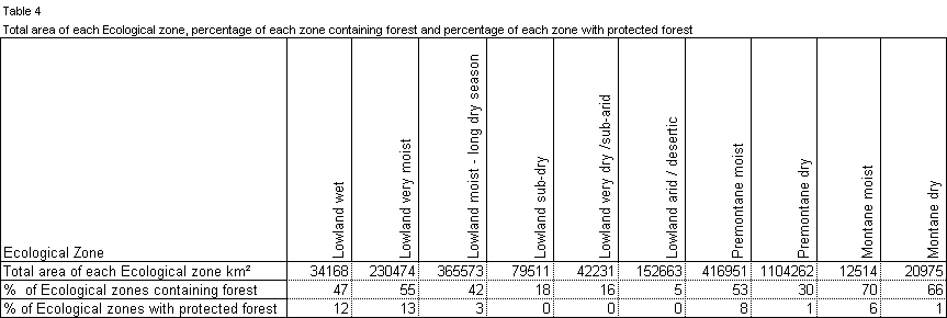 Table showing the total area of each ecological zone, percentage of each zone containing forest and the percentage of each zone with protected forest.