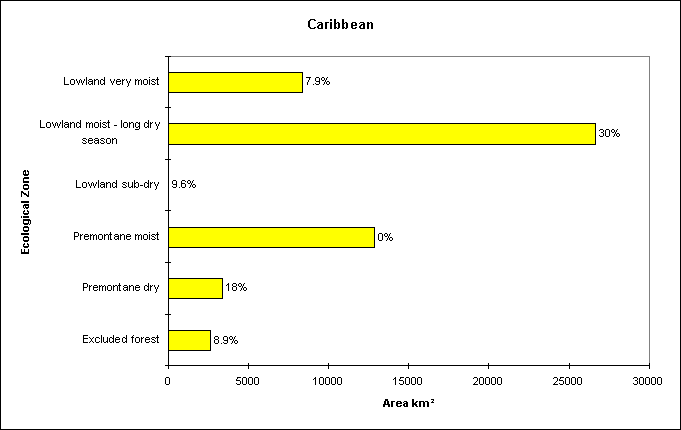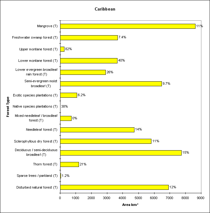Bar chart showing the total area of each forest type, with the percentage protected written above each bar.