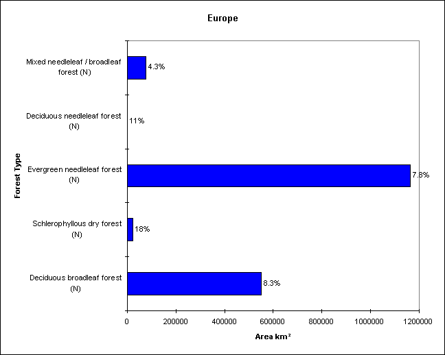 Bar chart showing the total area of each forest type, with the percentage protected written above each bar.