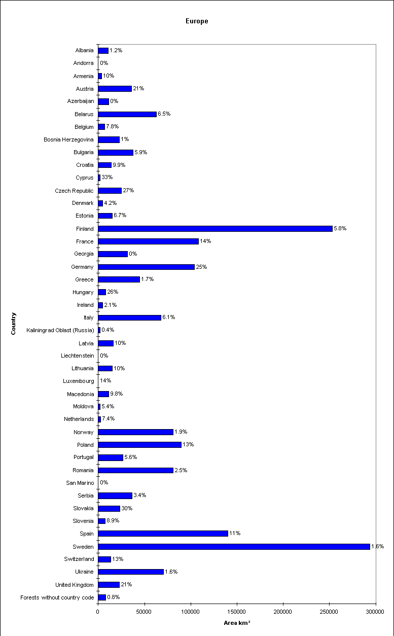 Bar chart showing the total area of forest in each Country, with the percentage protected written above each bar.