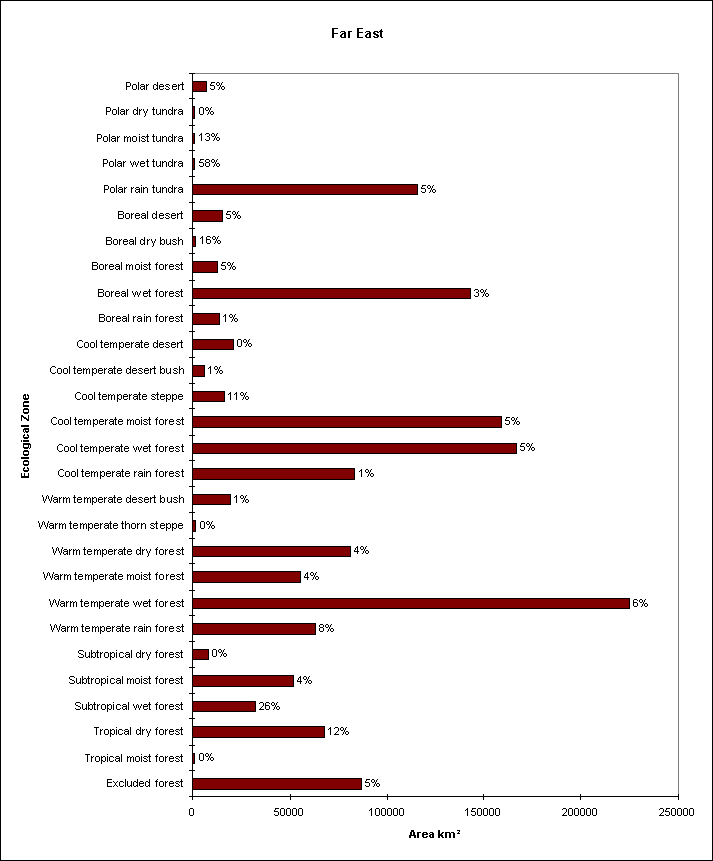 Bar chart showing the total area of each forest type, with the percentage protected written above each bar.