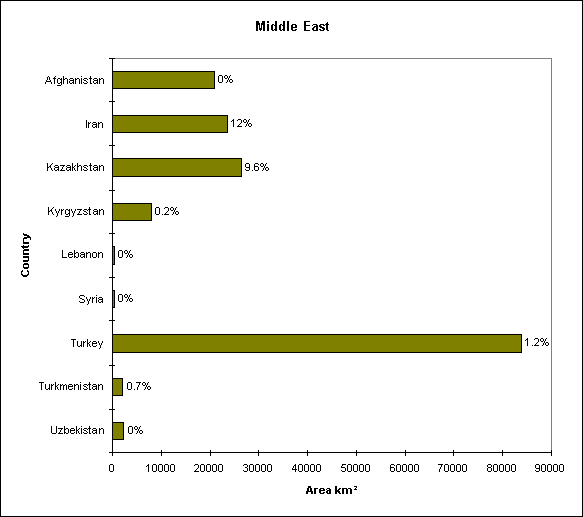 Bar chart showing the total area of forest in each Country, with the percentage protected written above each bar.
