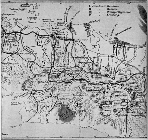 reichsten Landschaften, nicht nur in Java, sondern im ganzen malayischen Archipel. Sie enthält in ihrer nördlichen Hälfte, einem malerischen Gebirgslande, zahlreiche große Vulcane, in der südlichen Hälfte, die gegen den indischen Ocean abfällt, viele größere und kleinere, in diesen mündende Flüsse. Die Eisenbahn, welche von Batavia südwärts zwischen den Vulcanen Salak und Gedeh durchgeht, bildet vor Sukabumi einen rechten Winkel und schlägt nun die Richtung nach Osten ein; sie durchschneidet den schönsten Theil des Preanger Hochlandes. In kühnen Bogenlinien steigt sie an den bewaldeten Bergwänden empor, überschreitet auf schwindelnd hohen Brücken und Viaducten herrliche Thäler und gewährt wechselnde Blicke in das höchst fruchtbare und vortrefflich bebaute Tiefland. Rasch eilt der Zug zwischen diesen anmuthigen Landschaftsbildern hindurch, und man bedauert nur, sie nicht in größerer Muße genießen zu können.