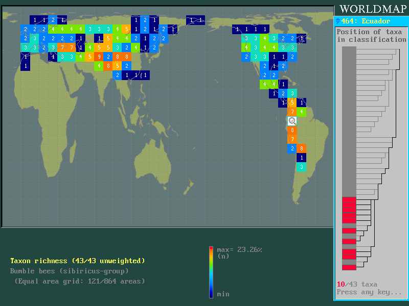 The example below shows counts of the numbers of species of sibiricus-group bumble bees among equal-area grid cells (c. 611,000 km2). The richer areas are shown in orange, the poorer areas are shown in dark blue, and the numbers show the number of species (below):