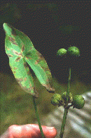 47. Alismataceae - Arrowhead; marsh and aquatic herbs; leaves basal, erect or floating, petiole long, bases sheathing, blades linear to sagitate or hastate; flowers perfect or imperfect (monoecious or dioecious), in racemes or panicles; sepals 3, separate, green; petals 3, separate, often white; stamens 6 to many; carpels 6 to many, unilocular, one ovule per locule; fruit an achene.