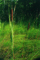 56. Typhaceae - Cattail; large perennial herbs of fresh to slightly brackish marshes and shores; leaves 2-ranked, blades linear, thick and spongy; inflorescence a dense cylindrical spike divided into a saminate and a pistillate part.