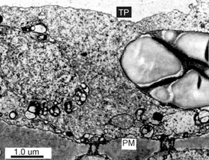 Within the wall, and usually pressed up against it is the plasma membrane (PM). This membrane regulates the uptake and exit of molecules and ions; it is involved in sensing signals from the environment and other cells in the plant and in cellulose synthesis. In addition to this external boundary, plant cells have an internal boundary, the tonoplast (TP) which encloses the vacuole. |