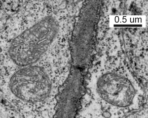 The mitochondrion is another double membrane bounded organelle with some of its own DNA and protein synthesis apparatus. As with the chloroplast, the synthesis of mitochondrial proteins is shared between the mitochodrion itself and the nucleus. Like the plastid and nucleus it reproduces by division. The role of mitochondria in respiration is described elsewhere |