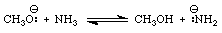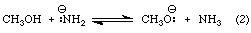 The pKa value of methanol is 16 while that of ammonia is 38. Ammonia is a much weaker acid than methanol. The equilibrium constant for Equation 2, therefore, must be greater than 1. Since the difference between the pKa values of methanol and ammonia is 38-16=22, the value of Keq for Equation 2 is approximately 1022. An analysis of this approach is available via the link below.