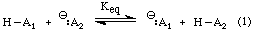 Exercise 2 Assume you mixed 100 molecules of H-A1 with 100 -:A2 ions. If the value of Keq were 1, at equilibrium the mixture would contain molecules of H-A1 -:A2 ions molecules of H-A2 and -:A1 ions.