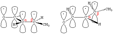 The conjugated alkene shown in Figure 3 is also called an a, b-unsaturated aldehyde. This means that the double bond is between the carbon atoms a and b to the carbonyl carbon. In this position the p orbitals of the double bond may interact with those of the carbonyl group to form an extended, i.e. delocalized, pi system. The delocalization of the electrons in this pi system results in greater stabilization since the electrons experience greater nuclear attraction. Figure 4 offers two perspectives of the orbital geometry that affords this extra stabilization. The trans isomer was chosen arbitrarily.